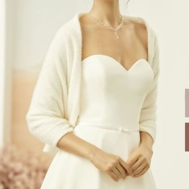 En mohair, laine ou cachemire, ils offrent une touche douce et bohème, parfaite pour un mariage en extérieur ou une soirée fraîche.