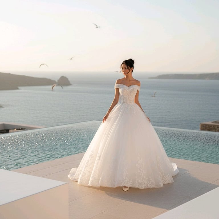 Inspirée des robes portées par les princesses des contes et des mariages royaux, elle représente la pureté, la magnificence et l’amour éternel. Chaque détail est pensé pour que la mariée se sente unique, rayonnante et souveraine le jour de son mariage.
